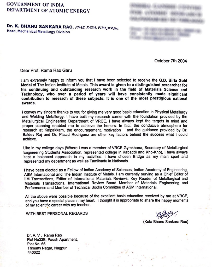 Dr. K. Bhanu Shankara Rao (Ministry of Steel, Chair Professor at Mahatma Gandhi Institute of Technology, Hyderabad) had written a letter to Prof. A V. Ramarao after he had been selected to receive the G. D. Birla Gold Medal of The Indian Institute of Metals.